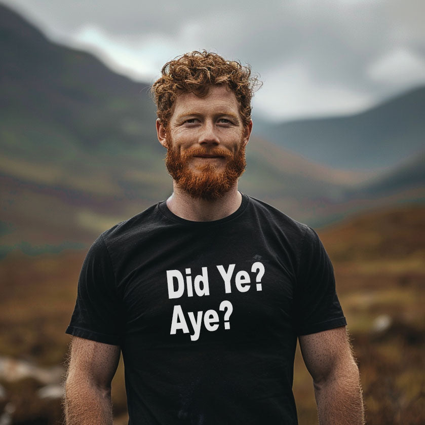 Few phrases capture Scottish humour better than "Did ye? Aye?" – the ultimate sarcastic comeback, now available in wearable form. Whether you're wearing it ironically or gifting it to a pal who dishes out patter like a pro, this t-shirt is sure to get a laugh.